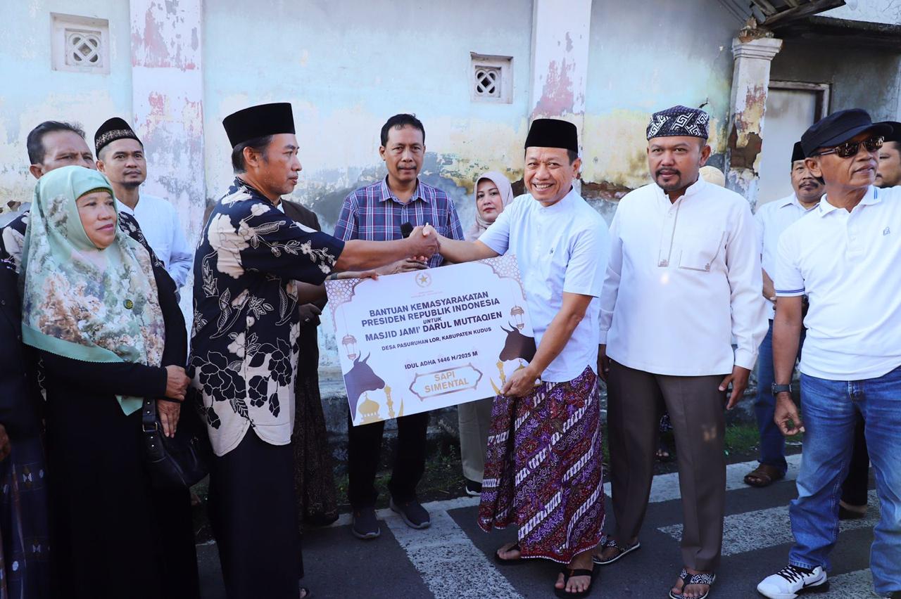 KUDUS - Sebagai wujud perhatian pemerintah pusat terhadap kesejahteraan masyarakat, Bupati Kudus Sam'ani Intakoris menyerahkan secara simbolis hewan kurban Bantuan Kemasyarakatan Presiden RI, Prabowo Subianto, di Masjid Darul Muttaqien, Desa Pasuruhan Lor, pada Sabtu (7/6/2025).