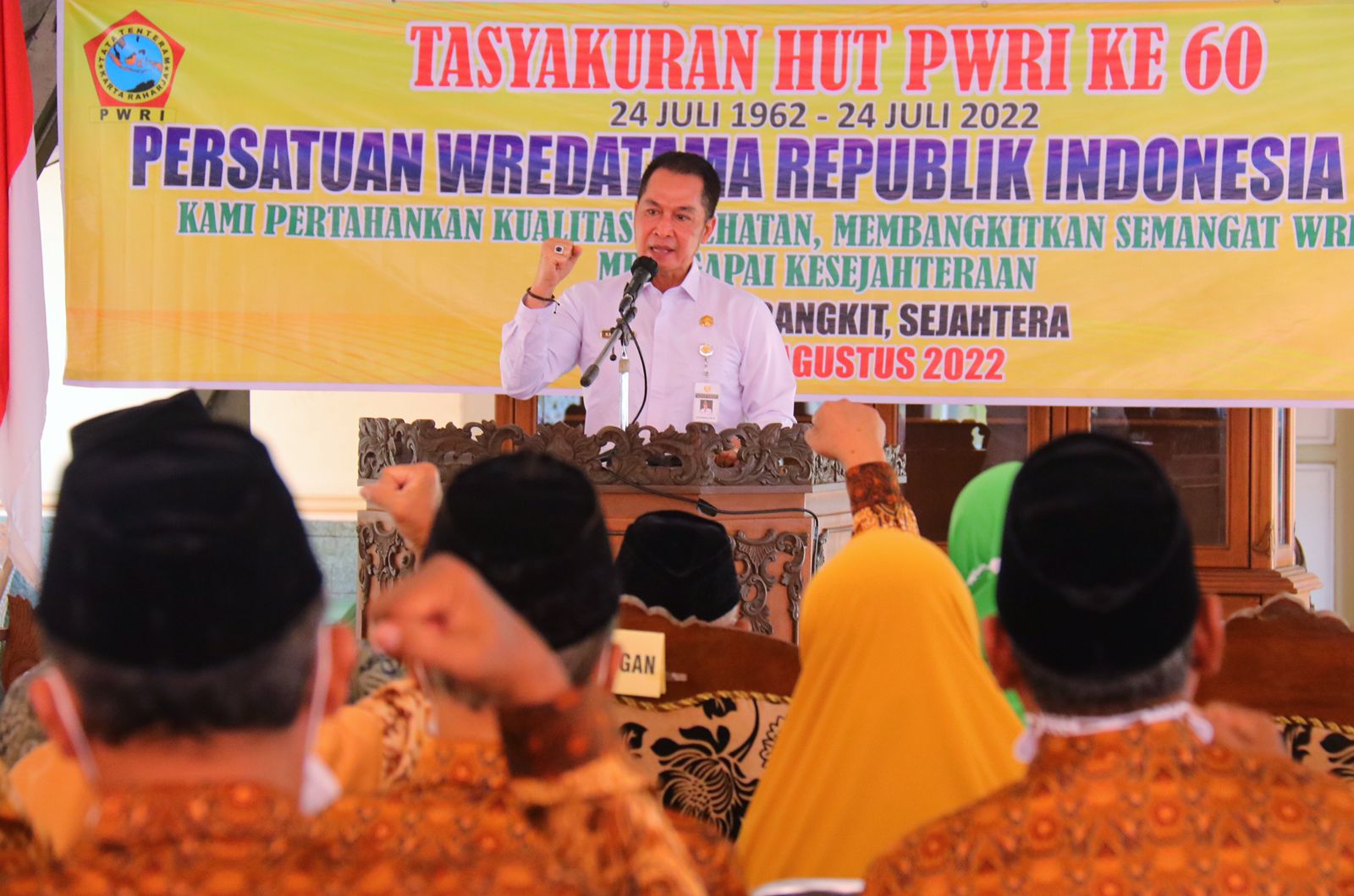 "Alhamdulillah, saya senang bertemu dengan panjenangan semua dalam keadaan sehat dan masih semangat," ucapnya kala memberikan sambutan dalam Tasyakuran Hari Ulang Tahun (HUT) ke-60 PWRI di rumah dinas wakil bupati, Kamis (11/8).